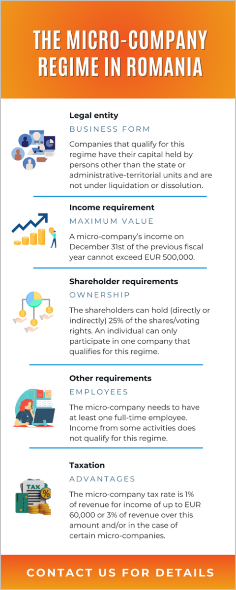 In 2021, the Romanian authorities have brought a set of clarifications to the regime, namely the manner in which the vehicles owned by micro-companies may be used for personal gain by the employees. This is a distinct advantage for this business form and the law now clarifies the following: this particular advantage is not subject to the income tax or social contributions. Previously, this could have been interpreted otherwise and micro-company owners could have been subject to paying income tax and social contributions for this advantage. Our team of experts can provide you with more details and clarifications.
